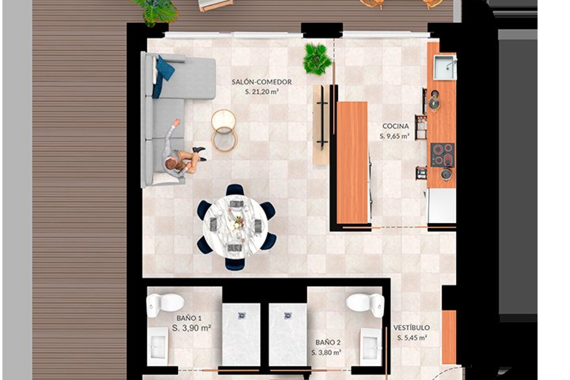 El interior de las viviendas está diseñado con un enfoque en el confort y la funcionalidad. Todas las propiedades están completamente amuebladas y equipadas con electrodomésticos modernos. Los suelos de gres porcelánico aportan un toque de elegancia y durabilidad. Los armarios empotrados ofrecen un almacenamiento eficiente, mientras que el aire acondicionado garantiza un ambiente agradable en cualquier estación. Con una distribución que incluye dos dormitorios y dos baños, estas viviendas están pensadas para satisfacer las necesidades de cualquier familia.