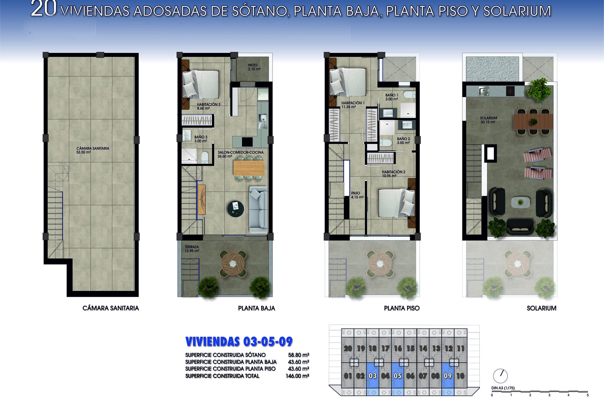 En el interior, los adosados están equipados con características que combinan estilo y funcionalidad. Los suelos de gres porcelánico aportan un toque moderno y son fáciles de mantener, ideales para el día a día. Los armarios empotrados en los dormitorios ofrecen un almacenamiento eficiente, manteniendo los espacios ordenados y libres de desorden. La distribución de tres dormitorios y tres baños está pensada para ofrecer el máximo confort y privacidad, adaptándose a las necesidades de familias o parejas que buscan un hogar espacioso y bien organizado. Cada detalle interior está diseñado para proporcionar un ambiente acogedor y práctico, haciendo de estos adosados una opción atractiva para quienes buscan una residencia en Dolores.