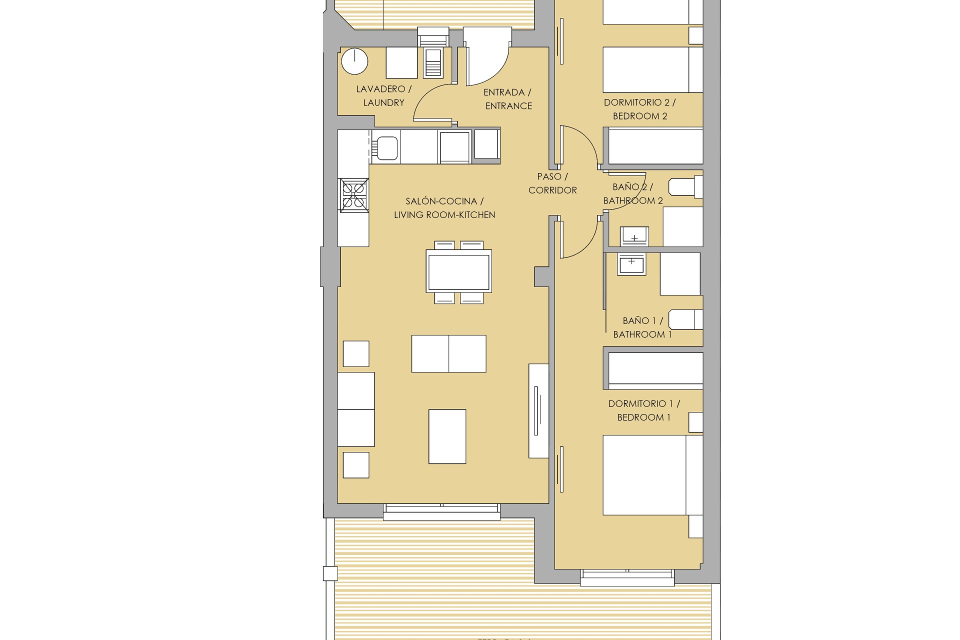 El interior de las viviendas está cuidadosamente diseñado para ofrecer confort y funcionalidad. Los apartamentos, bungalows con solarium y bungalows con jardín están disponibles en configuraciones de 2 o 3 dormitorios, todos ellos con 2 baños, lo que garantiza comodidad para familias de diferentes tamaños. Las propiedades cuentan con armarios empotrados, optimizando el espacio de almacenamiento y manteniendo el orden. El suelo cerámico aporta un toque moderno y es fácil de mantener, ideal para el estilo de vida actual. Además, las viviendas están equipadas con aire acondicionado y preinstalación para aire acondicionado, asegurando un ambiente agradable durante todo el año.