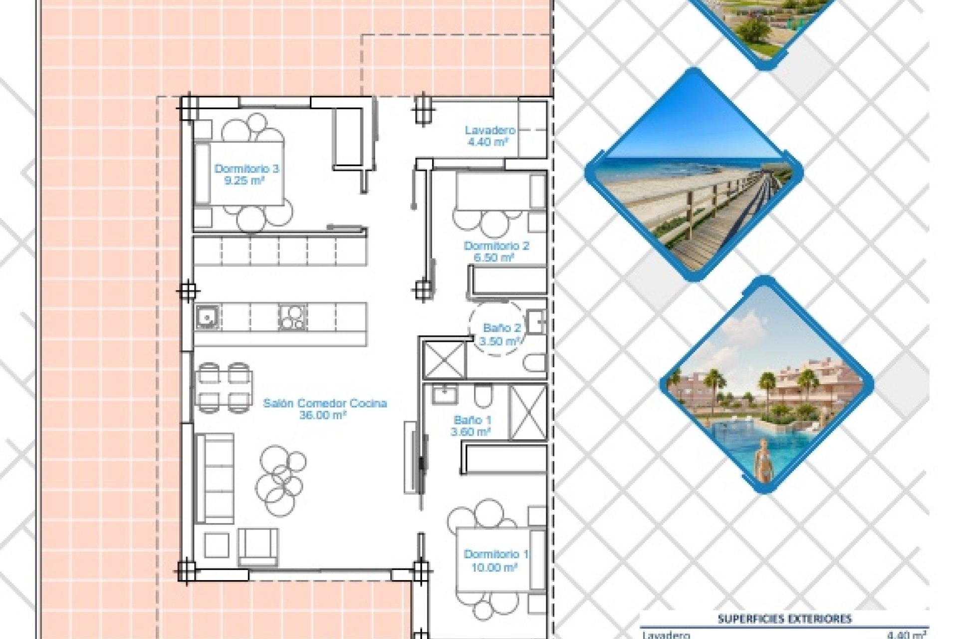 Los exteriores de este residencial están diseñados para maximizar el disfrute del clima mediterráneo. Cada propiedad cuenta con un jardín privado, ideal para crear un espacio verde personalizado o para disfrutar de momentos al aire libre en familia. Las terrazas amplias ofrecen un lugar perfecto para relajarse, tomar el sol o disfrutar de cenas al aire libre. Además, algunas tipologías incluyen un solárium, proporcionando un espacio adicional para el ocio y el relax. La presencia de un garaje asegura la comodidad y seguridad del estacionamiento, un aspecto esencial para la vida moderna. La distancia de solo 2 km hasta el mar permite disfrutar de vistas despejadas y de la cercanía a la playa, haciendo de estos exteriores un verdadero oasis de tranquilidad.