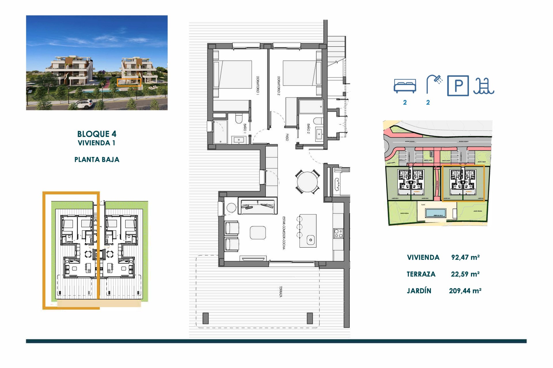 El interior de las viviendas está diseñado con un enfoque en la funcionalidad y el confort. Todas las propiedades cuentan con dos dormitorios y dos baños, ofreciendo un espacio adecuado para familias o parejas. Los suelos de gres porcelánico aportan un toque de elegancia y son fáciles de mantener. La preinstalación de aire acondicionado asegura que el clima interior sea siempre agradable, mientras que los armarios empotrados ofrecen un almacenamiento eficiente. La seguridad y comodidad están garantizadas con la inclusión de videoportero en cada unidad. Además, cada propiedad dispone de un garaje, proporcionando un espacio seguro para el estacionamiento.