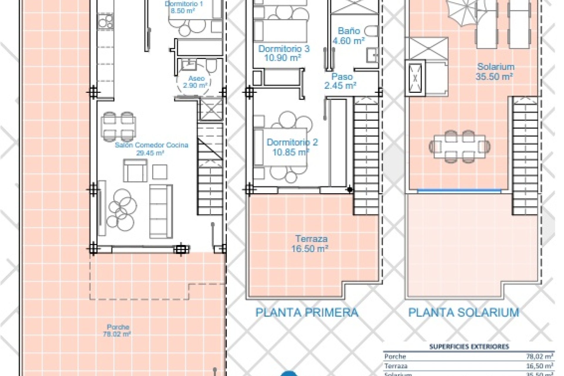 Los exteriores de estos adosados están pensados para maximizar el disfrute del clima mediterráneo. Cada vivienda cuenta con un jardín privado, perfecto para relajarse o disfrutar de actividades al aire libre. Además, disponen de una terraza y un solárium, ofreciendo múltiples espacios para disfrutar del sol y las vistas. El acceso a un garaje privado añade comodidad y seguridad para los residentes.
