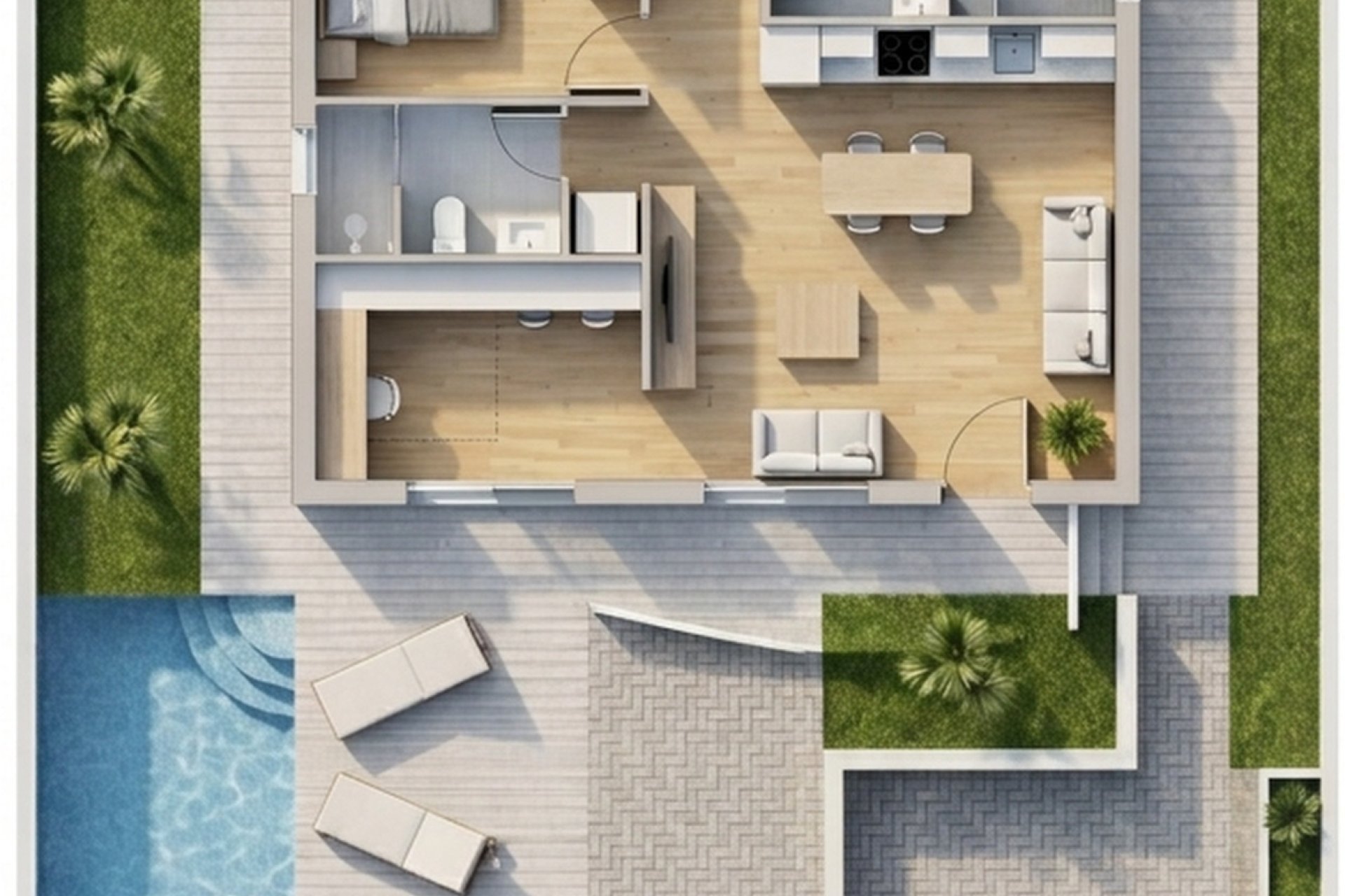 Los exteriores de estos bungalows están diseñados para maximizar el disfrute del clima mediterráneo. Cada propiedad cuenta con un jardín privado, perfecto para crear un oasis personal al aire libre. Además, las terrazas amplias ofrecen un espacio ideal para relajarse o entretener a los invitados. Para aquellos que buscan un toque de lujo adicional, algunas unidades disponen de un solárium, proporcionando un espacio adicional para disfrutar del sol en total privacidad. La inclusión de una piscina privada en cada bungalow asegura momentos de diversión y relajación sin salir de casa. Las persianas eléctricas no solo añaden comodidad, sino que también contribuyen a la eficiencia energética de la vivienda.