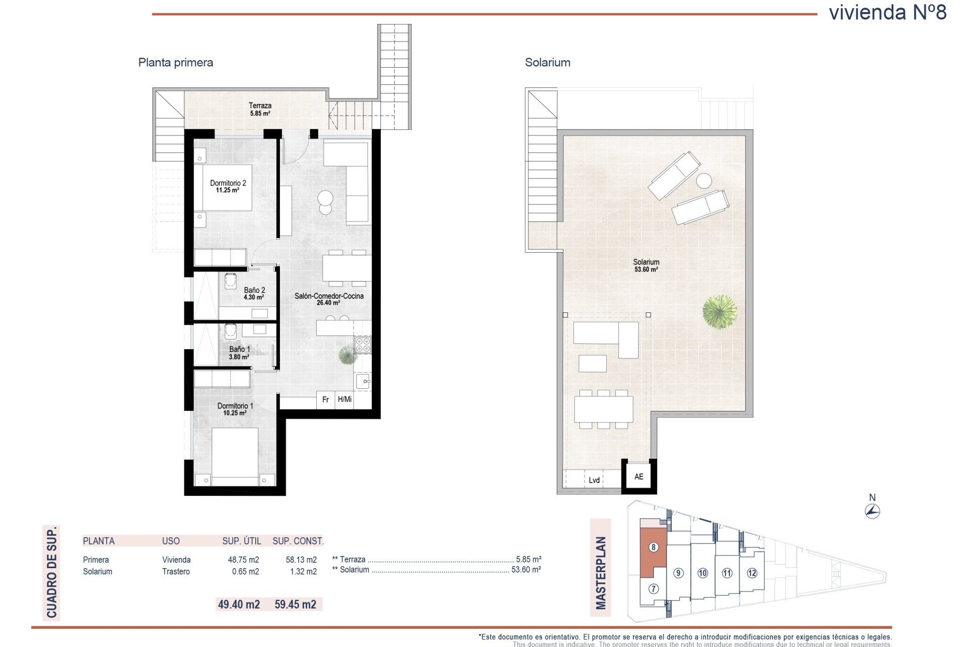 El interior de los bungalows está pensado para ofrecer un espacio acogedor y moderno. Los suelos de cerámica aportan un toque elegante y son fáciles de mantener. Las viviendas disponen de uno o dos dormitorios, y uno o dos baños, según la tipología elegida, lo que permite adaptarse a diferentes necesidades familiares. Los armarios empotrados proporcionan un almacenamiento eficiente, manteniendo el orden y la estética del hogar. Además, cada propiedad incluye una terraza y un solárium, ampliando las posibilidades de disfrutar del aire libre desde la comodidad del hogar. La seguridad está garantizada con un videoportero, que añade un nivel extra de protección y tranquilidad.