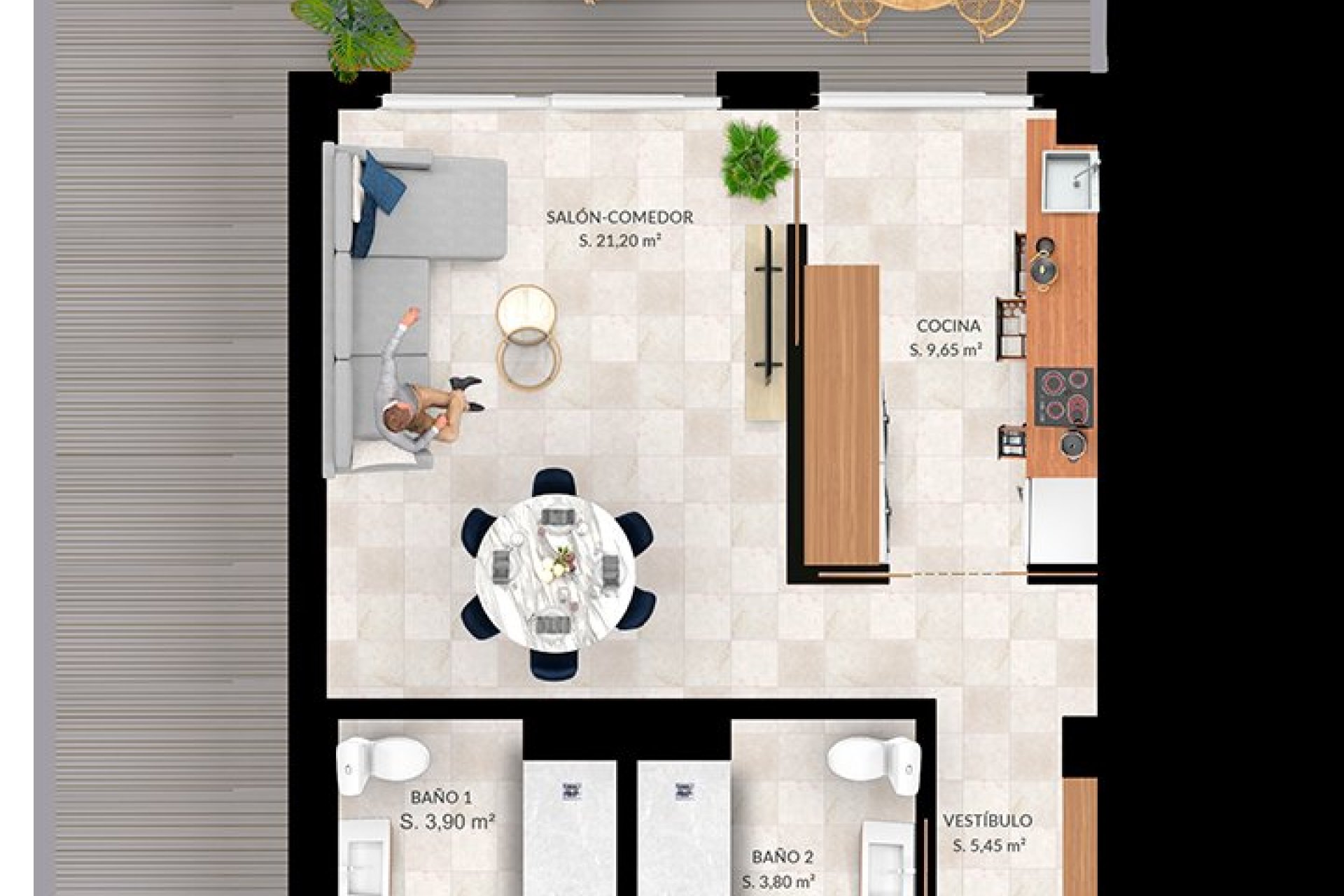 The homes feature outdoor spaces that invite relaxation and enjoyment of the Mediterranean climate. Each property has a terrace and solarium, perfect for sunbathing or enjoying an outdoor dinner. Additionally, some types offer the possibility of having a private garden, expanding leisure and recreation options. The option of a private pool is available, allowing residents to enjoy a refreshing swim in the privacy of their home.