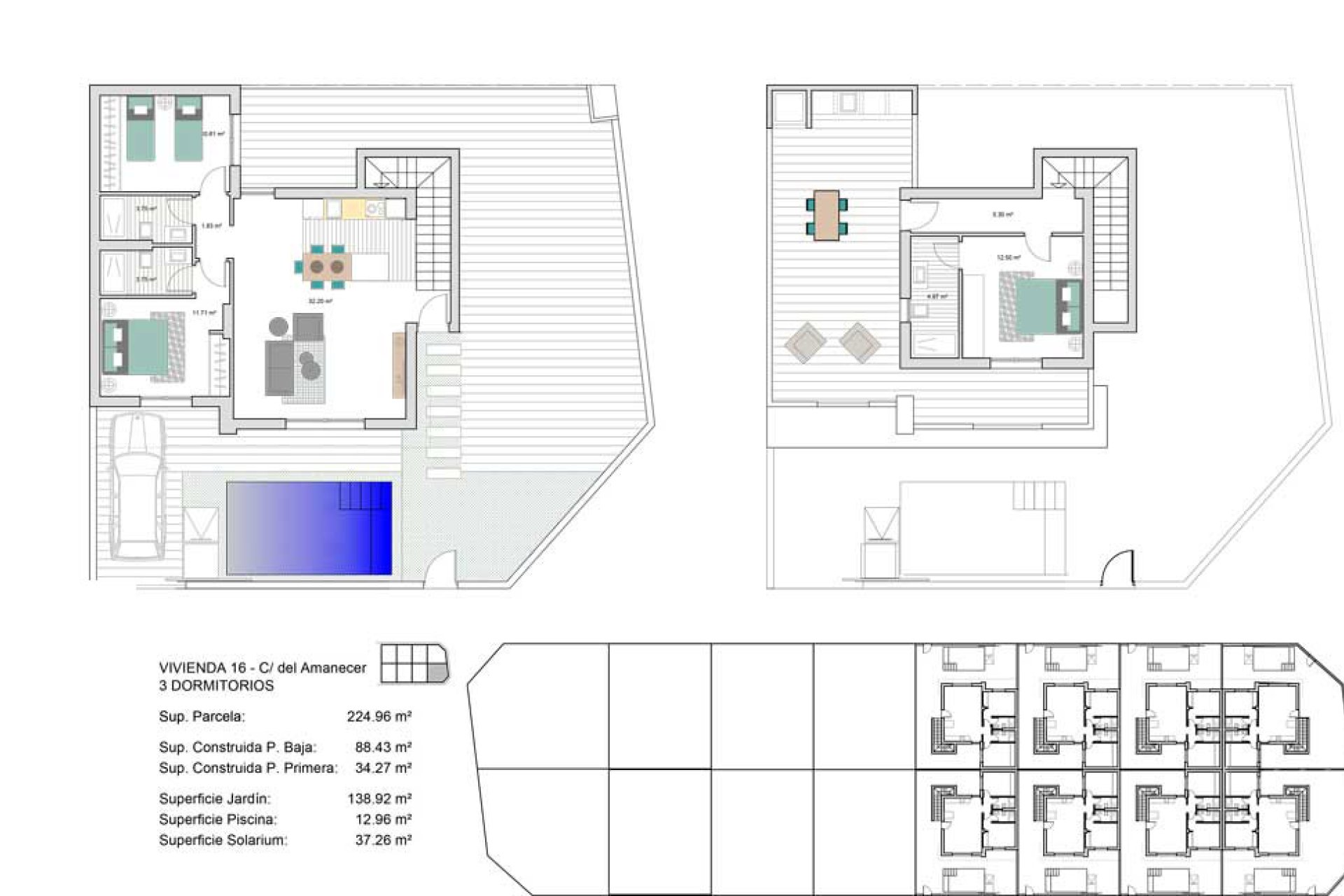 3It is a luxury complex of one or two-storey villas, depending on the number of bedrooms, with private swimming pool, terrace area and solarium with summer kitchen that allows you to enjoy all hours of sunshine, every day of the year. Each villa has 2 or 3 bedrooms and 2-3 bathrooms. Designed with a contemporary style and open concept, consisting of a fully fitted kitchen and living-dining room. The development is located in Roldán (Murcia), within a gated and security controlled urbanization. It is close to the beach, surrounded by services, parks, sports facilities and several golf courses.