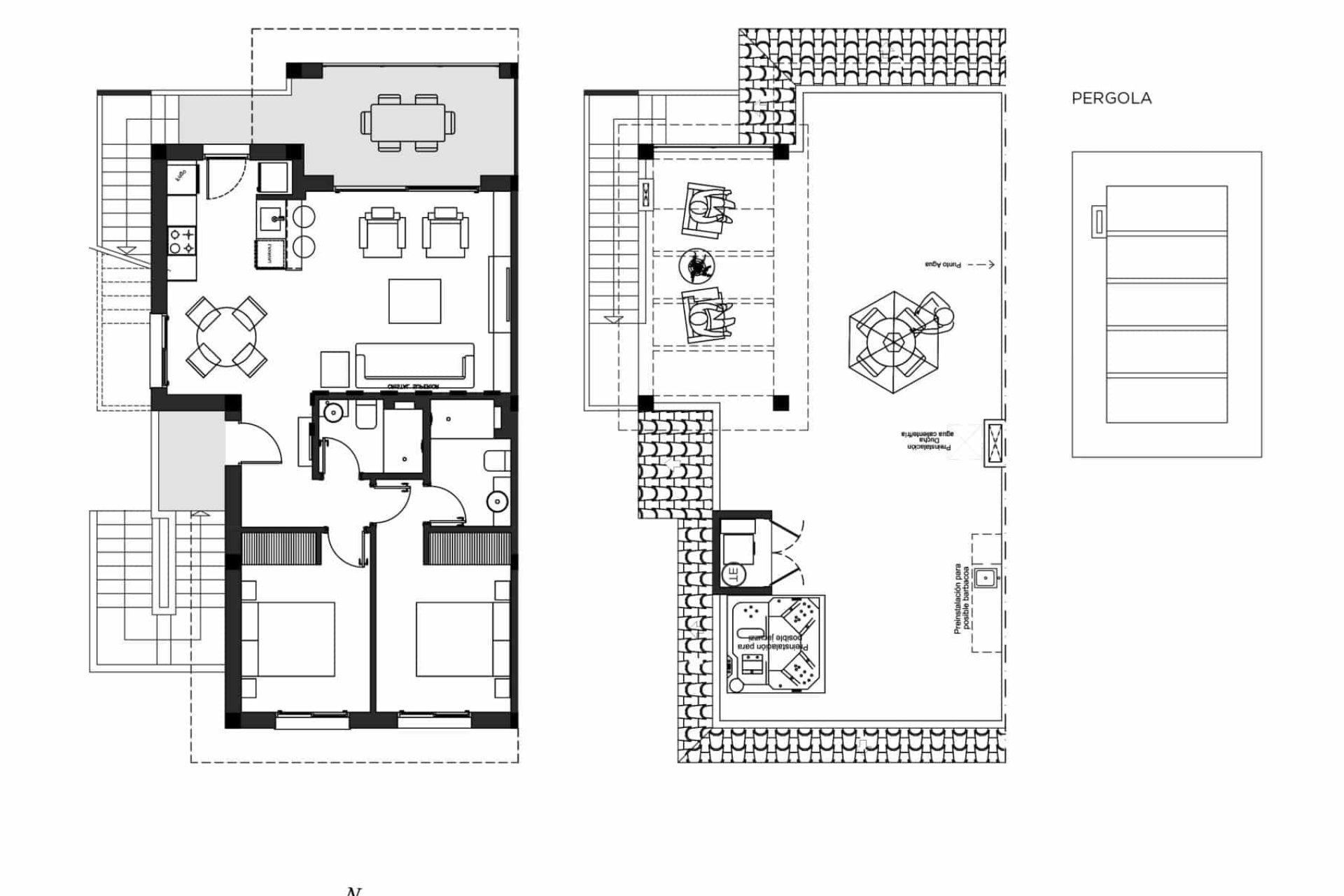 The interior of the bungalows is designed with attention to detail, incorporating modern and practical features. Porcelain stoneware floors provide an elegant and durable finish, while electric blinds and integrated appliances make daily life easier. Built-in wardrobes offer efficient storage, and the jacuzzi adds a touch of luxury and relaxation. With a layout that includes two bedrooms and two bathrooms, each space is optimized for comfort and privacy.