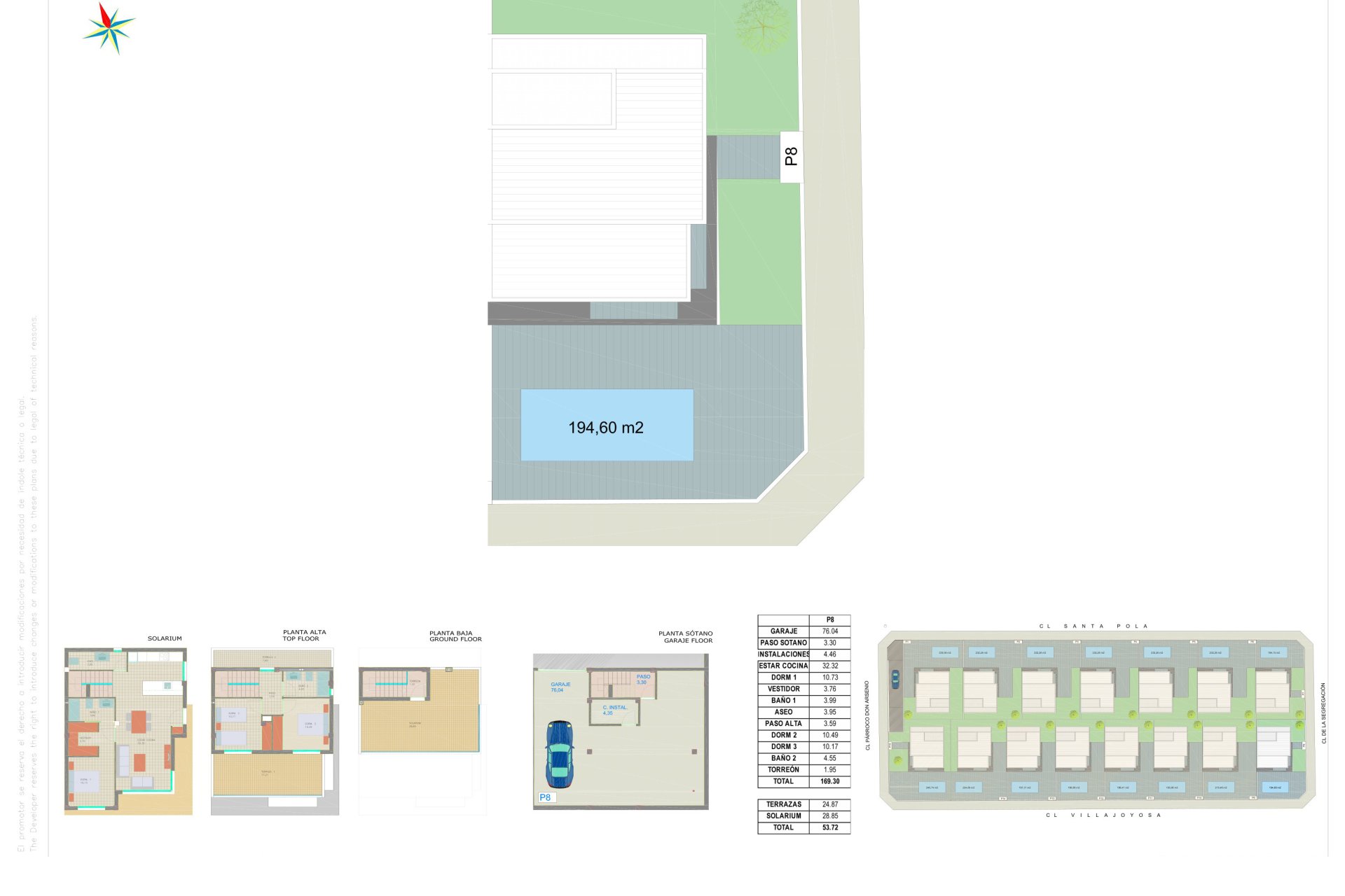 The residential complex has a perimeter enclosure with a white concrete block wall and a pedestrian entrance gate. The communal areas are paved with porcelain stoneware and landscaped with artificial grass. Each property has its own swimming pool with cascade jet. In addition, there are telephone, TV, satellite and letter boxes at the entrance.