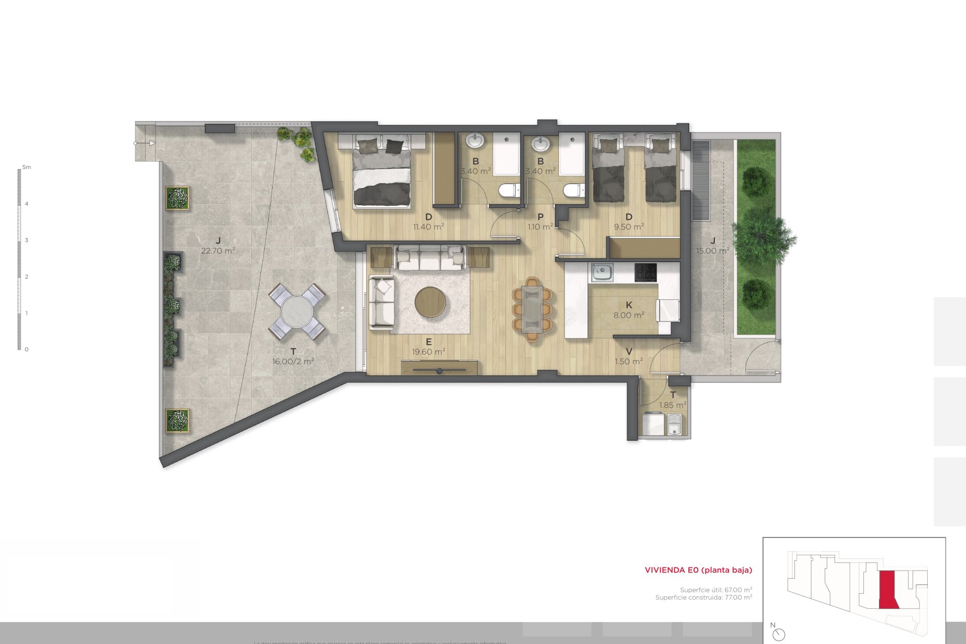 The interior of these bungalows has been carefully designed to offer maximum comfort and functionality. Layout options include properties with 2 or 3 bedrooms and 2 bathrooms, catering to different family needs. Ceramic floors add a modern touch and are easy to maintain. Comfort is ensured with the installation of air conditioning and high-quality appliances. Built-in wardrobes provide efficient storage, while the video intercom adds an extra level of security and convenience. Each property also includes a garage, ensuring a secure space for the vehicle.