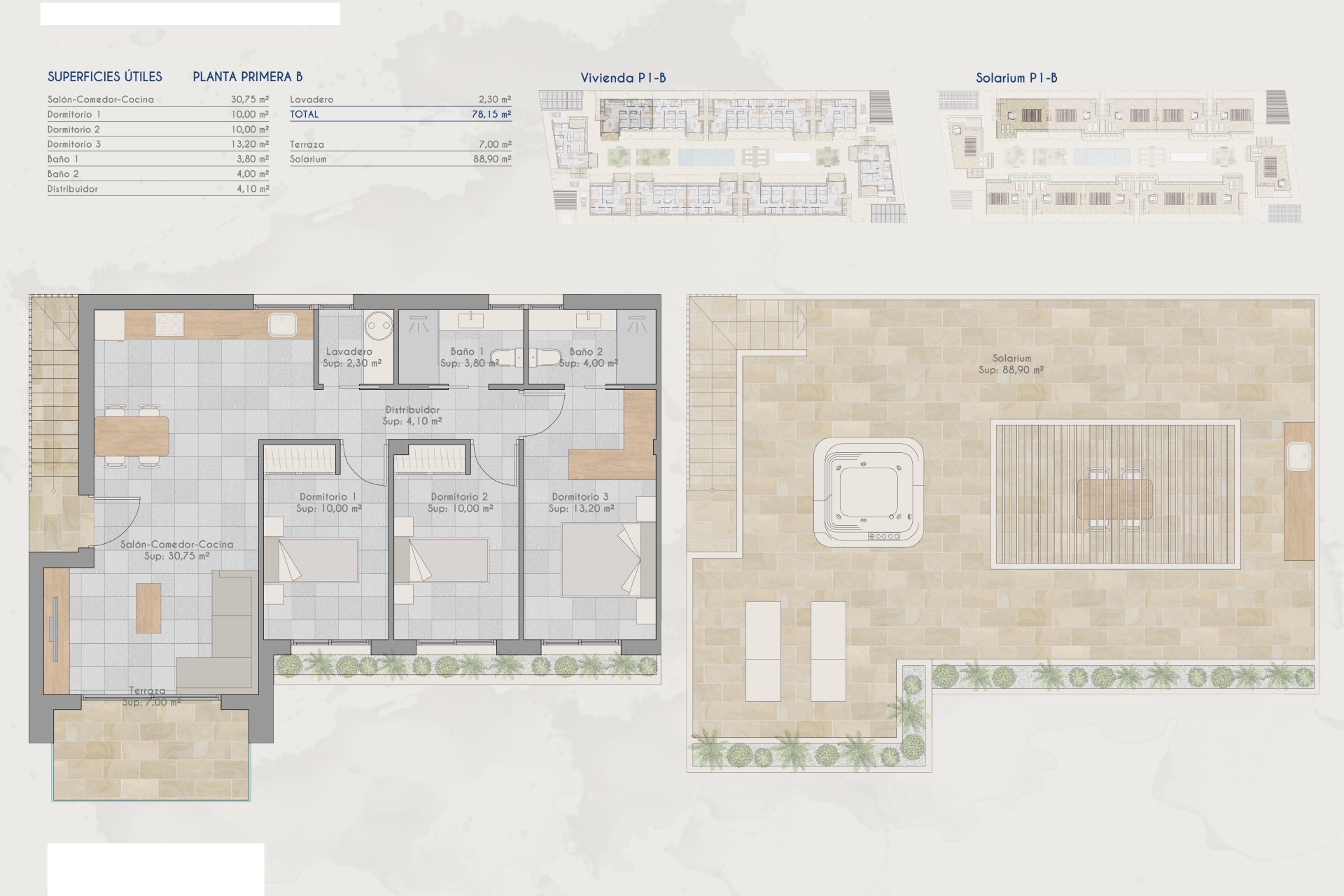 The outdoor spaces of these homes in Torre-Pacheco are designed to enjoy the Mediterranean climate. Each property features a private terrace, perfect for outdoor relaxation. Additionally, the homes include a solarium, offering additional space for sunbathing or enjoying the views of the surroundings. The presence of a pergola adds a touch of elegance and functionality, providing shade and style to the outdoor areas.