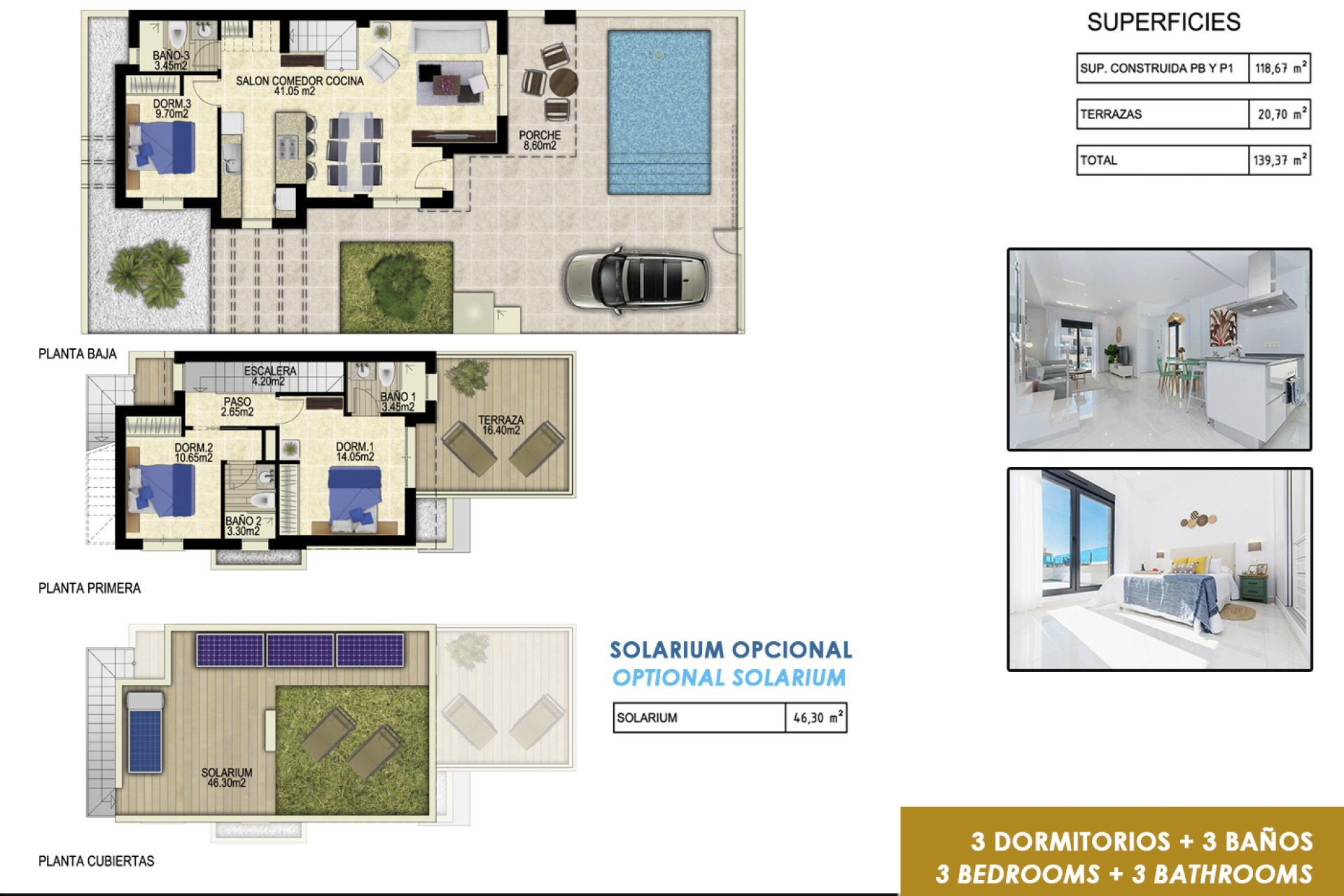3The villas are built on large plots with a minimum of 174 m2 with garden area, private swimming pool and parking for the car. Inside, the villas consist of 3 bedrooms, 3 bathrooms and a spacious living room with open plan kitchen. There are solar panels on the roof and there is also the option to make an additional roof terrace where you can enjoy the Spanish sun all day long. In addition, all villas have fully fitted bathrooms with underfloor heating, fully equipped kitchen with all appliances, fitted wardrobes and electric blinds.