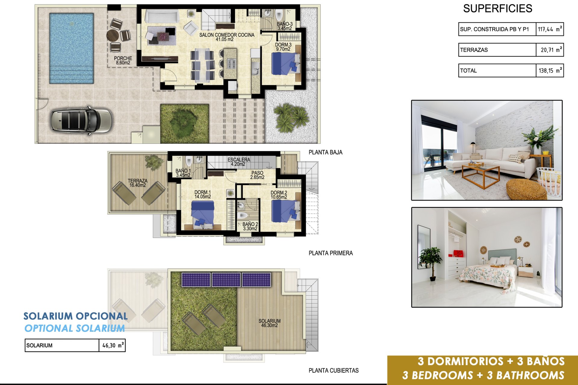 3Located in the charming town of Orihuela, this residential complex offers 39 detached homes that stand out for their modern and functional design. These properties are designed for those seeking a home in a tranquil setting, yet with all amenities within reach. Proximity to a golf course, just 0.85 km away, adds an additional appeal for golf enthusiasts. The homes feature three bedrooms and three bathrooms, providing a spacious and comfortable space for the whole family. The option to choose an optional solarium allows residents to enjoy the Mediterranean climate to the fullest.