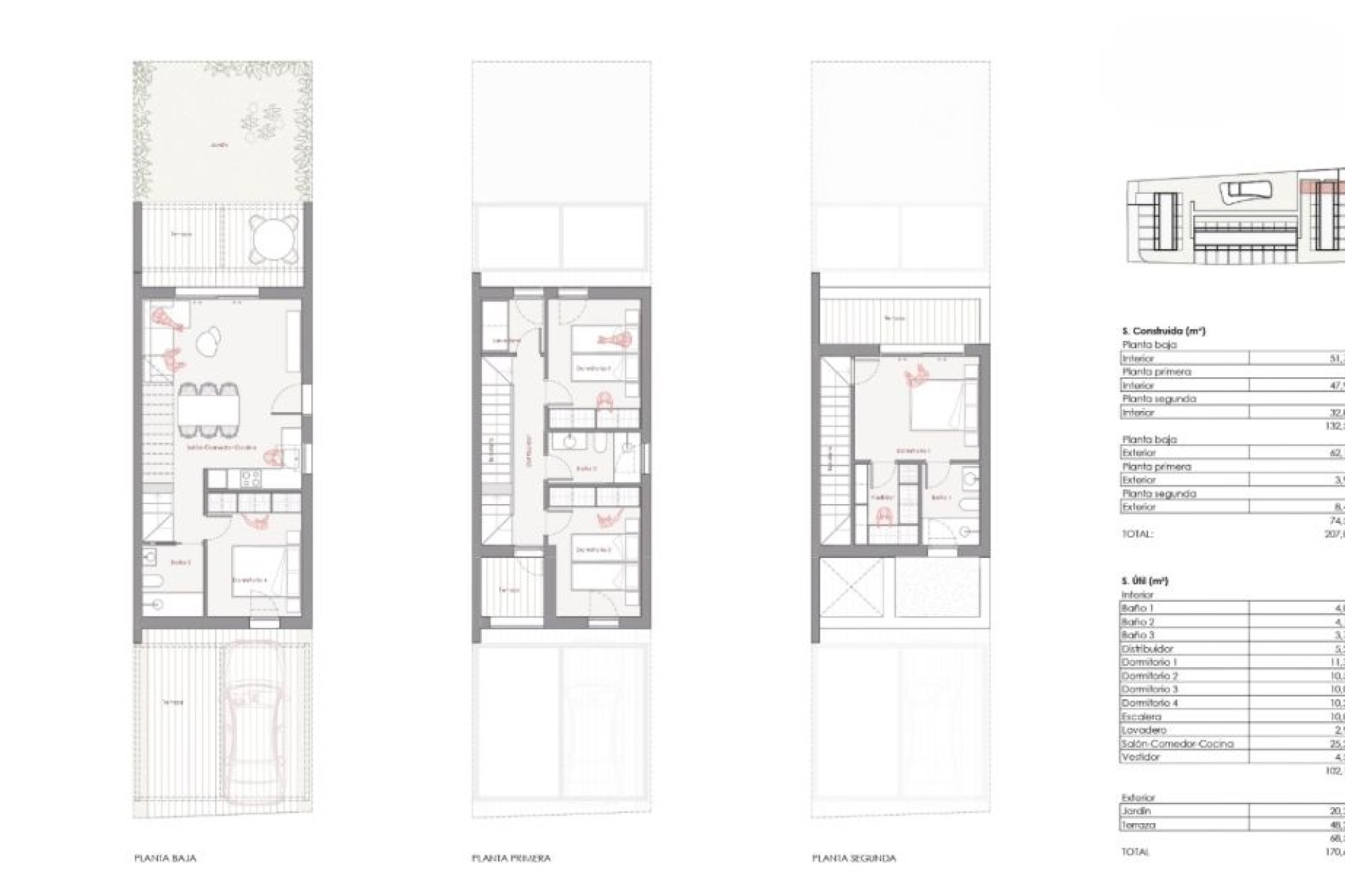 The outdoor spaces of these townhouses in Dénia are designed to enjoy the Mediterranean climate. Each home features a private garden, perfect for relaxation or outdoor activities. Additionally, the terraces provide extra space to enjoy the views and fresh air. The proximity to the sea, just 200 meters away, allows for coastal walks and water activities at any time.