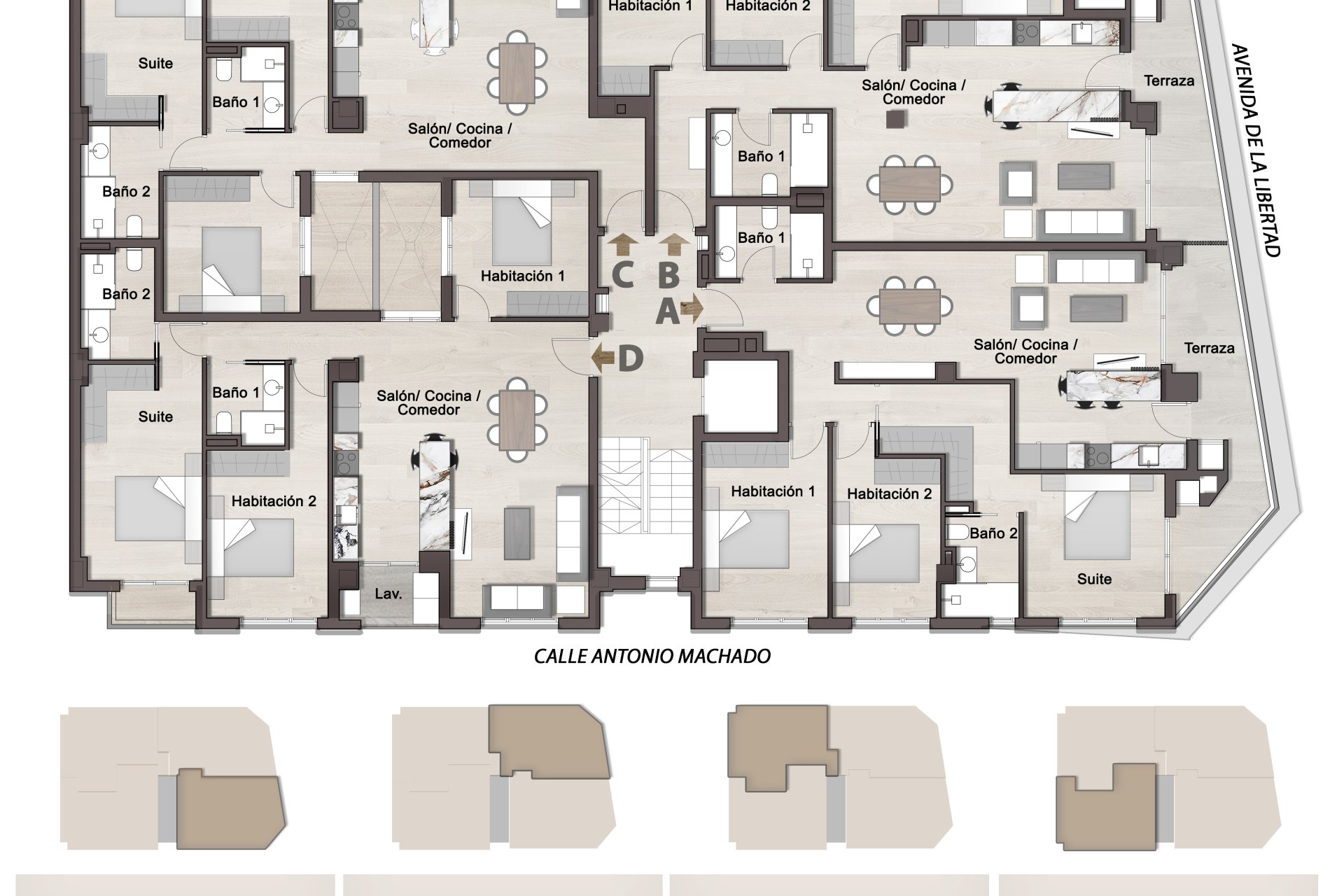 The interiors of the apartments and penthouses in Redován are designed to offer a modern and functional space. With three bedrooms and two bathrooms, these homes are perfect for families or those seeking additional space. Electric blinds and pre-installed air conditioning ensure a comfortable environment year-round. Built-in wardrobes provide practical storage solutions, while integrated home automation allows efficient control of home functions, adapting to the needs of modern living.