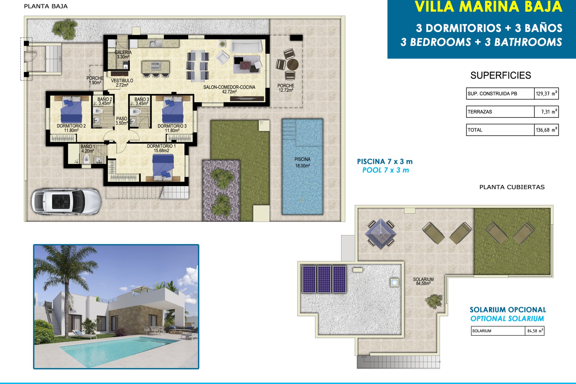 Inside, the homes are equipped with porcelain tile floors that add a touch of elegance and durability. The electric shutters and included appliances make daily life easier, while the built-in wardrobes offer efficient and discreet storage. The pre-installation of air conditioning ensures the home stays cool during the warmer months. The layout of the homes, with three bedrooms and three bathrooms, is designed to maximize comfort and functionality, allowing for harmonious and comfortable living for all family members.