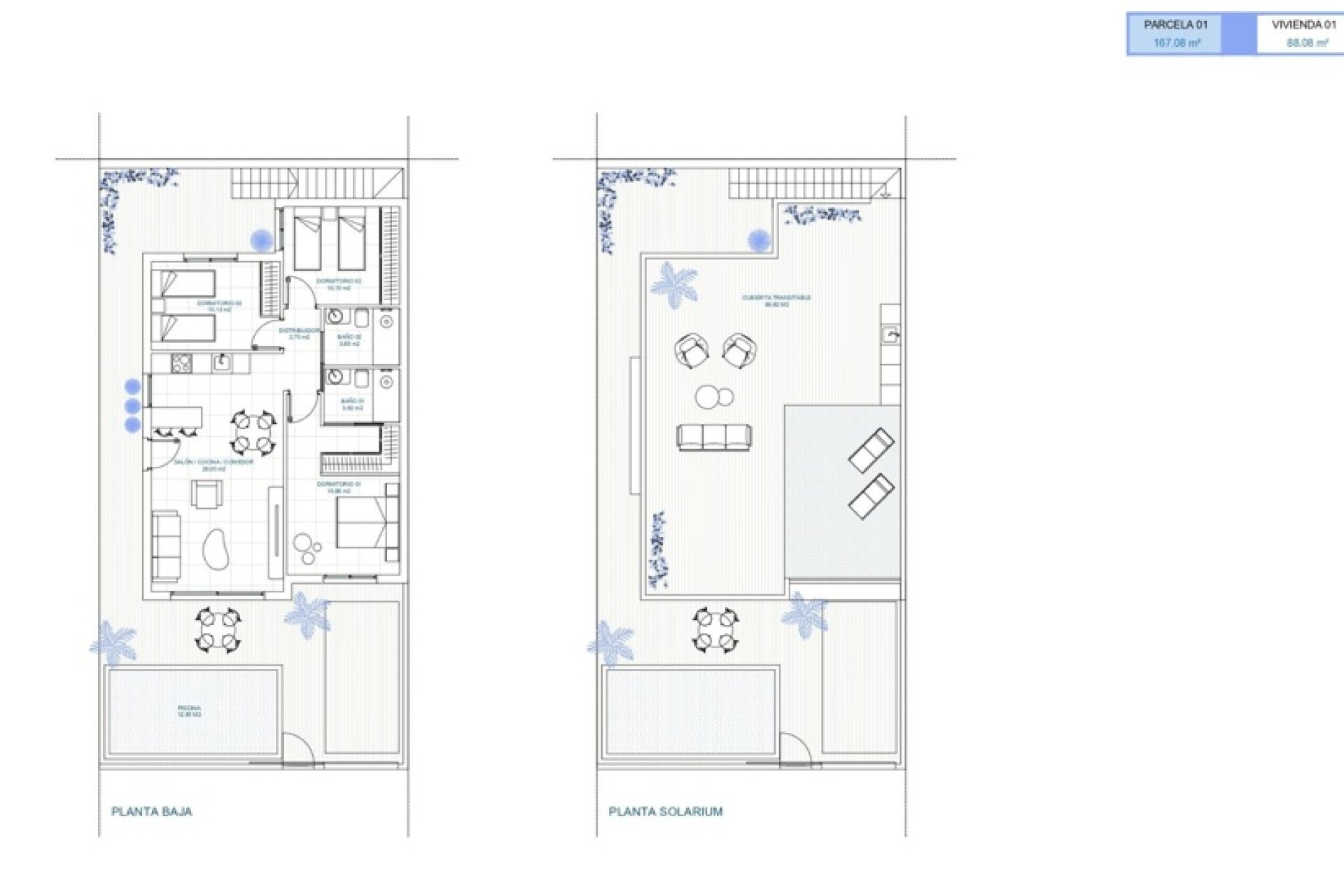 The exteriors of these townhouses are designed to make the most of the Mediterranean climate. Each property features a private terrace, ideal for outdoor relaxation or family meals. Additionally, the solarium provides extra space for sunbathing or enjoying the surrounding views. The inclusion of a private pool in each townhouse adds a touch of luxury and exclusivity, allowing for refreshing dips on the hottest days.