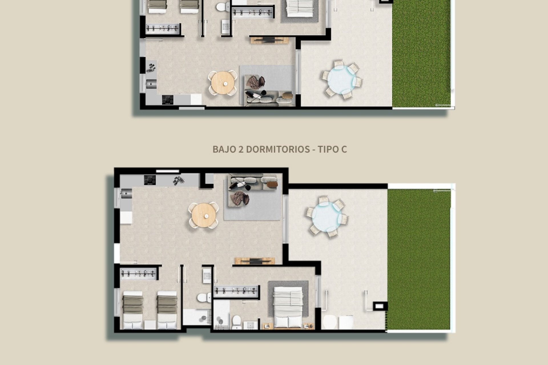 The homes are equipped with modern features that ensure a high level of comfort. Porcelain floors add a touch of elegance and durability, while electric shutters and integrated appliances make daily life easier. Built-in wardrobes optimize storage space, maintaining order and functionality. Layout options include homes with 2 and 3 bedrooms, with 2 or 3 bathrooms, adapting to different family sizes and personal preferences.