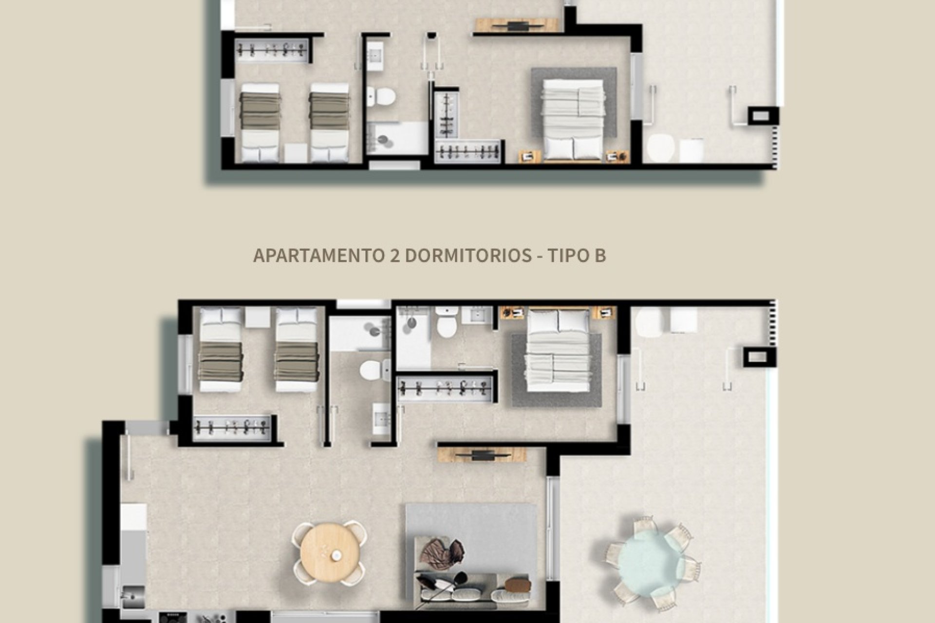 The homes are equipped with modern features that ensure a high level of comfort. Porcelain floors add a touch of elegance and durability, while electric shutters and integrated appliances make daily life easier. Built-in wardrobes optimize storage space, maintaining order and functionality. Layout options include homes with 2 and 3 bedrooms, with 2 or 3 bathrooms, adapting to different family sizes and personal preferences.