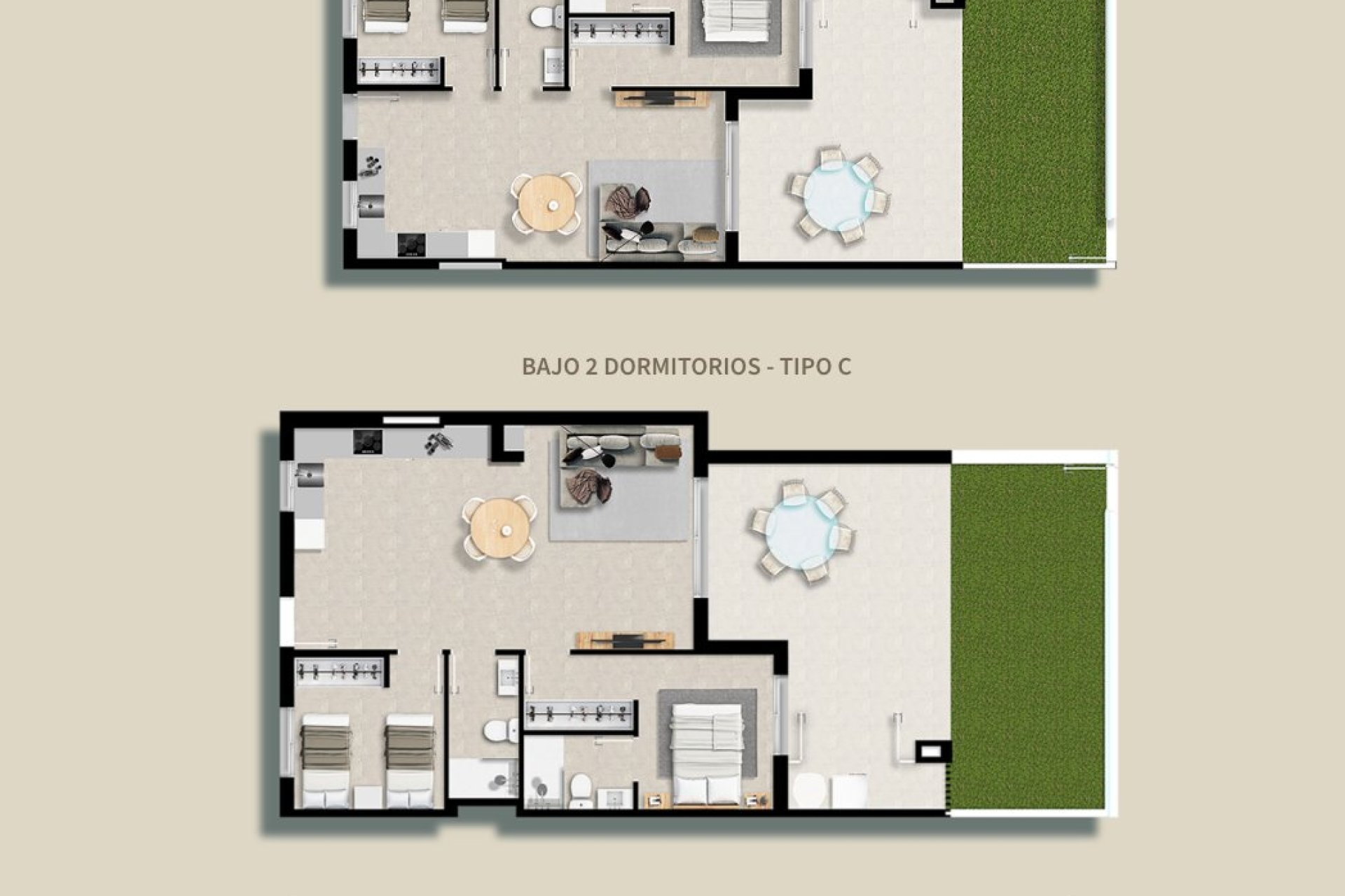 The interiors of the flats in this gated development are designed to offer a modern and comfortable living space. With a constructed area of 78 m² and 68 m² usable area, the 2-bedroom, 2-bathroom flats feature high quality finishes and durable materials. The modern kitchens are equipped with state-of-the-art appliances and integrate seamlessly with the living room, creating an open and bright atmosphere. The double bedrooms have built-in wardrobes that optimise storage space. The large windows let in plenty of natural light, enhancing the feeling of spaciousness and connection to the outside. The 3-bedroom, 2-bathroom penthouses also offer a private solarium, ideal for enjoying the panoramic views and Mediterranean climate.