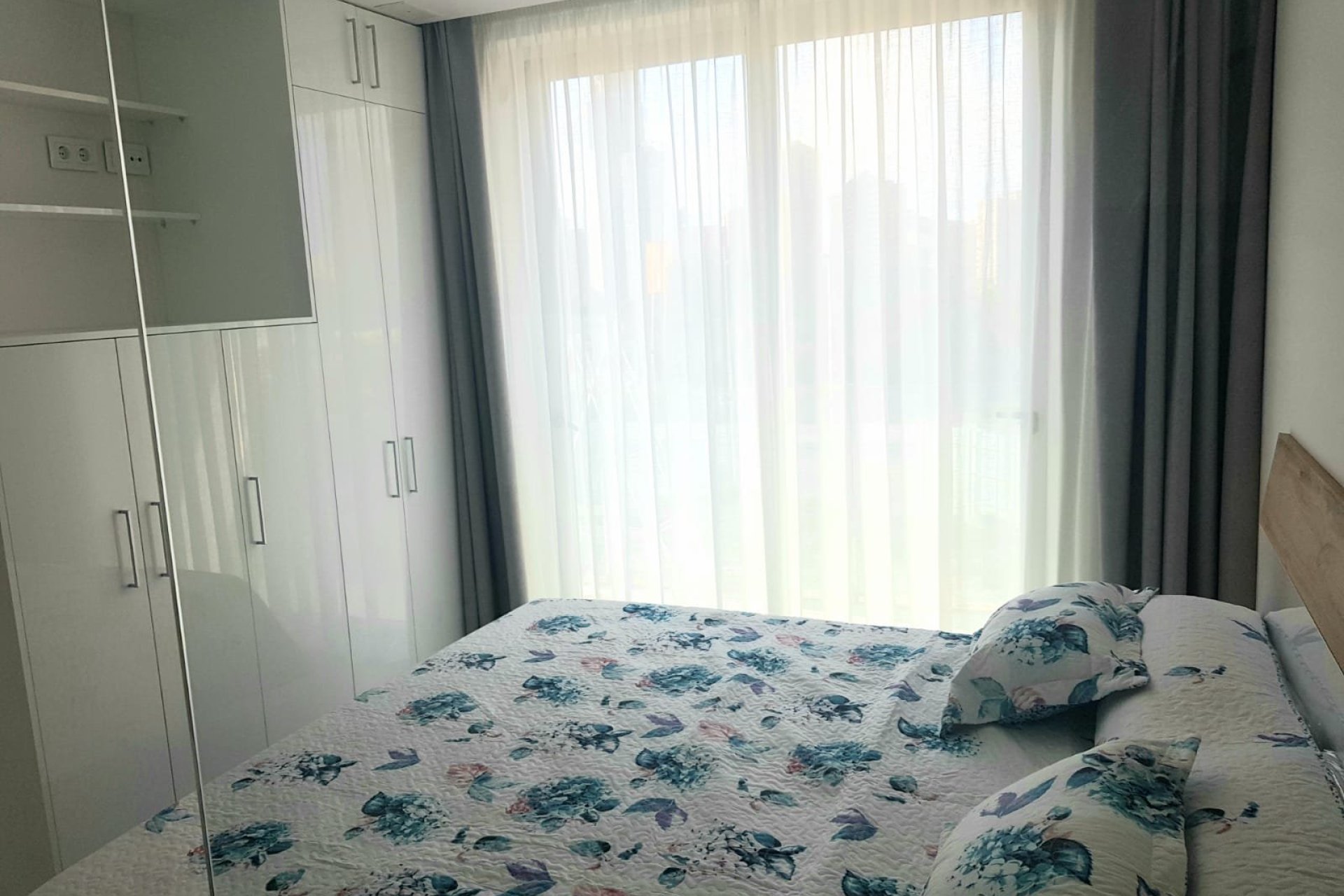 The interiors of the flats are designed to maximise space and natural light. With a constructed area of 79 m² and 57 m² of usable space, each flat has 1 bedroom and 2 full bathrooms. The open-plan living room is integrated with the kitchen, creating a spacious and bright environment. High-quality finishes and modern technologies, such as the energy-saving robotic system and remote door opening, ensure a comfortable and efficient environment. The flats are equipped with large windows that let in natural light, enhancing the feeling of space and connection with the outside.