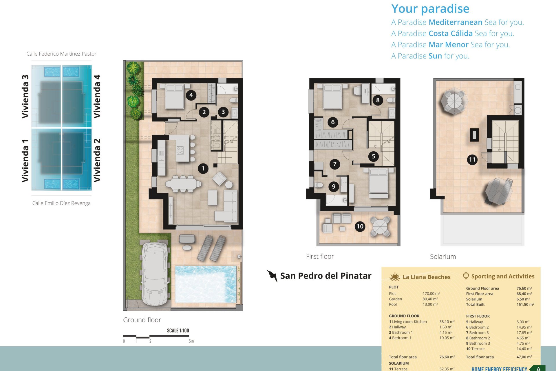 The exteriors of these homes are designed to enjoy the Mediterranean climate. Each property features a private garden, perfect for creating a personal green space. Additionally, they have a private pool, ideal for cooling off during warm summer days. The terraces and solariums offer additional outdoor spaces, perfect for relaxing or enjoying outdoor gatherings with open views.