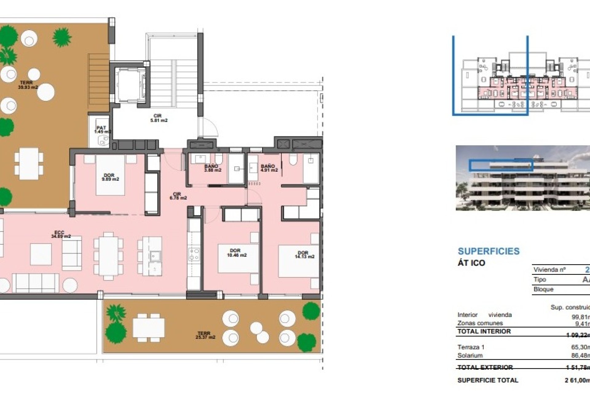 The interior of these penthouses in Torre-Pacheco is designed to offer a modern and welcoming atmosphere. With three bedrooms and two bathrooms, each space is optimized for comfort and functionality. Porcelain tile floors add a touch of elegance and durability, while underfloor heating ensures a warm environment during the colder months. Climate control is a priority, with air conditioning and pre-installation for greater energy efficiency. Built-in wardrobes offer practical and discreet storage, and the ability to charge electric vehicles adds a touch of modernity and sustainability.