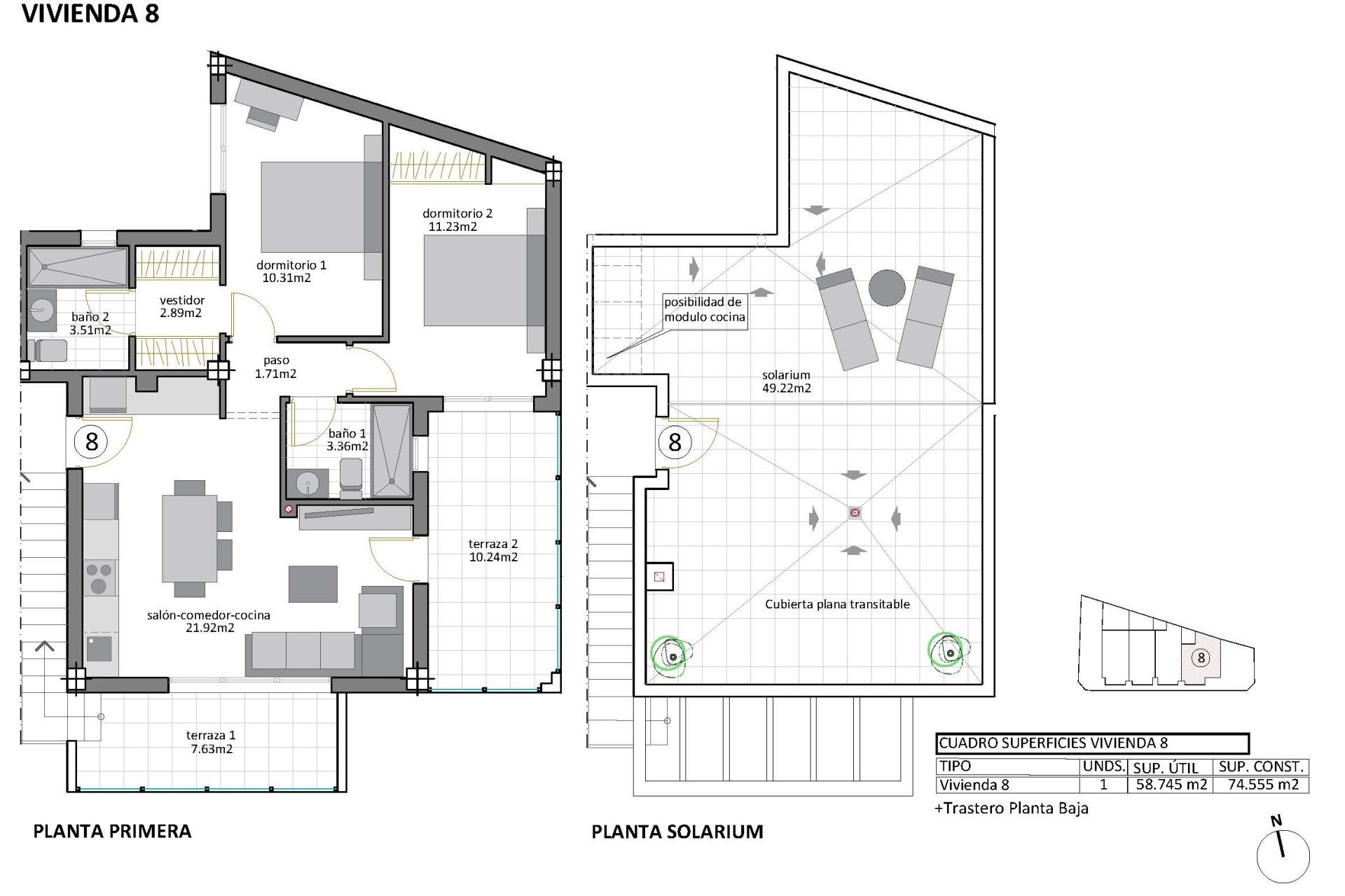 The exteriors of these properties are designed to enjoy the Mediterranean climate. Each bungalow has a private garden, perfect for moments of outdoor relaxation. Additionally, the terraces offer extra space to enjoy sea views and the natural surroundings. The inclusion of a solarium provides an ideal spot for sunbathing in privacy, while pergolas add a touch of elegance and shade, creating a welcoming environment for outdoor gatherings.