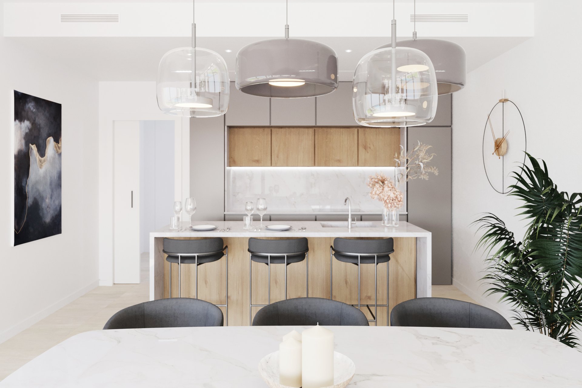 The interiors of the villas in Polop are designed for comfort and style. The open concept kitchens are fully equipped with modern appliances, including hob, oven, extractor hood and sink. The equally equipped bathrooms add a touch of luxury. All villas have a parking space included in the price. The interior spaces are spacious and bright, with high quality finishes that reflect a contemporary and functional design.
