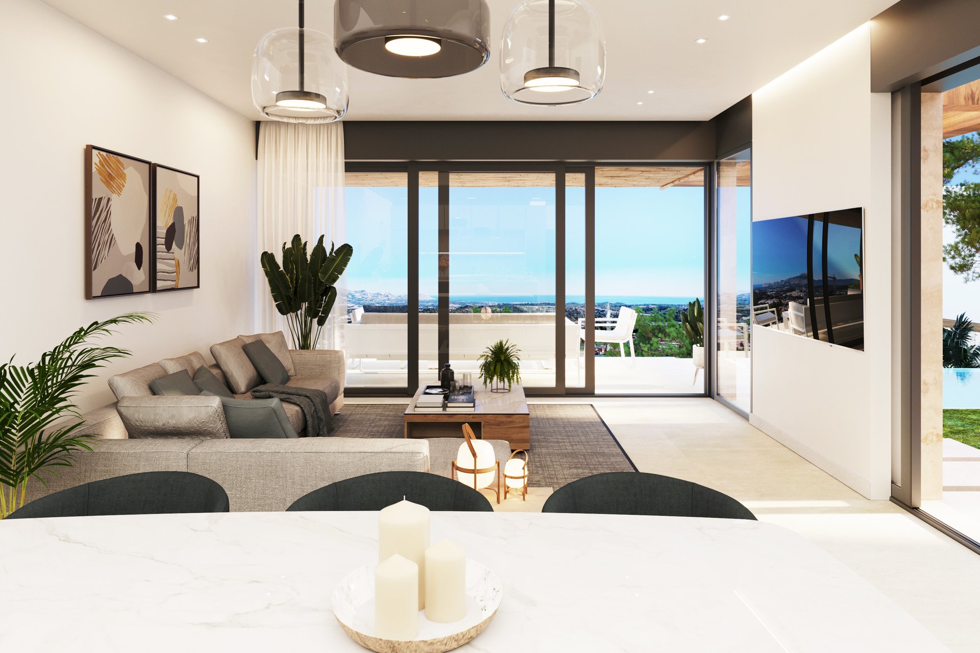 The villas in Polop are distinguished by their elegant and functional exterior design, designed to blend in perfectly with the natural surroundings. They have large terraces, gardens, porches and solariums that allow you to enjoy the outdoors. The plots offer the option of adding a private swimming pool, either infinity or conventional, or a Jacuzzi in the solarium for the single-storey villas. The panoramic views from the terraces capture the beauty of the bay of Altea and the majestic mountains of Alicante, creating a perfect environment to relax and enjoy.