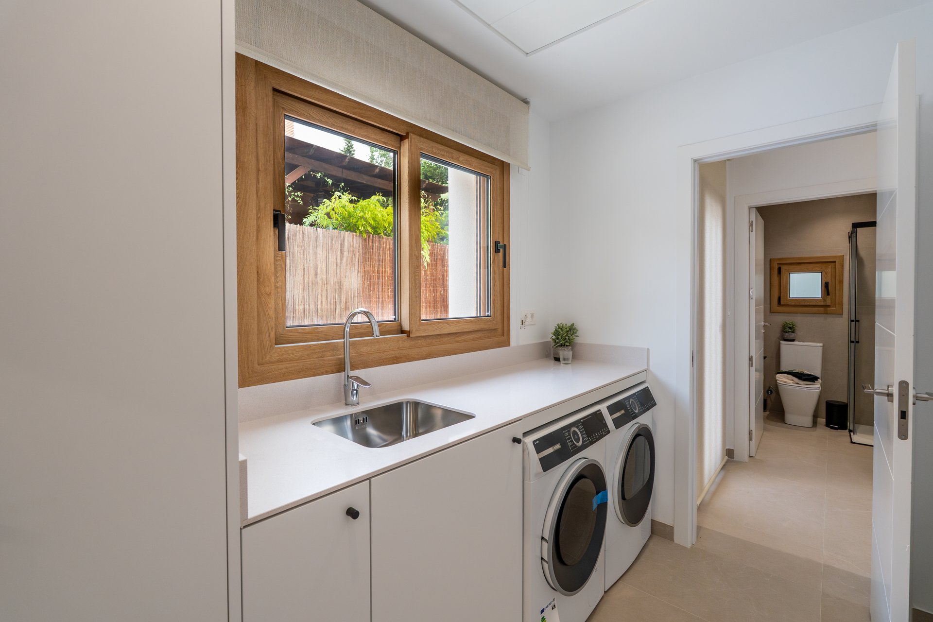 The villa's interior is equipped with modern and high-quality features. Porcelain stoneware floors add an elegant touch and are easy to maintain. The villa comes fully furnished, making moving in easy and allowing you to enjoy comfort from day one. The kitchen is equipped with state-of-the-art appliances, making meal preparation a pleasant experience. The air conditioning system ensures a fresh environment all year round. Electric shutters and a video intercom add an extra level of comfort and security. Built-in wardrobes in the bedrooms offer ample storage space.