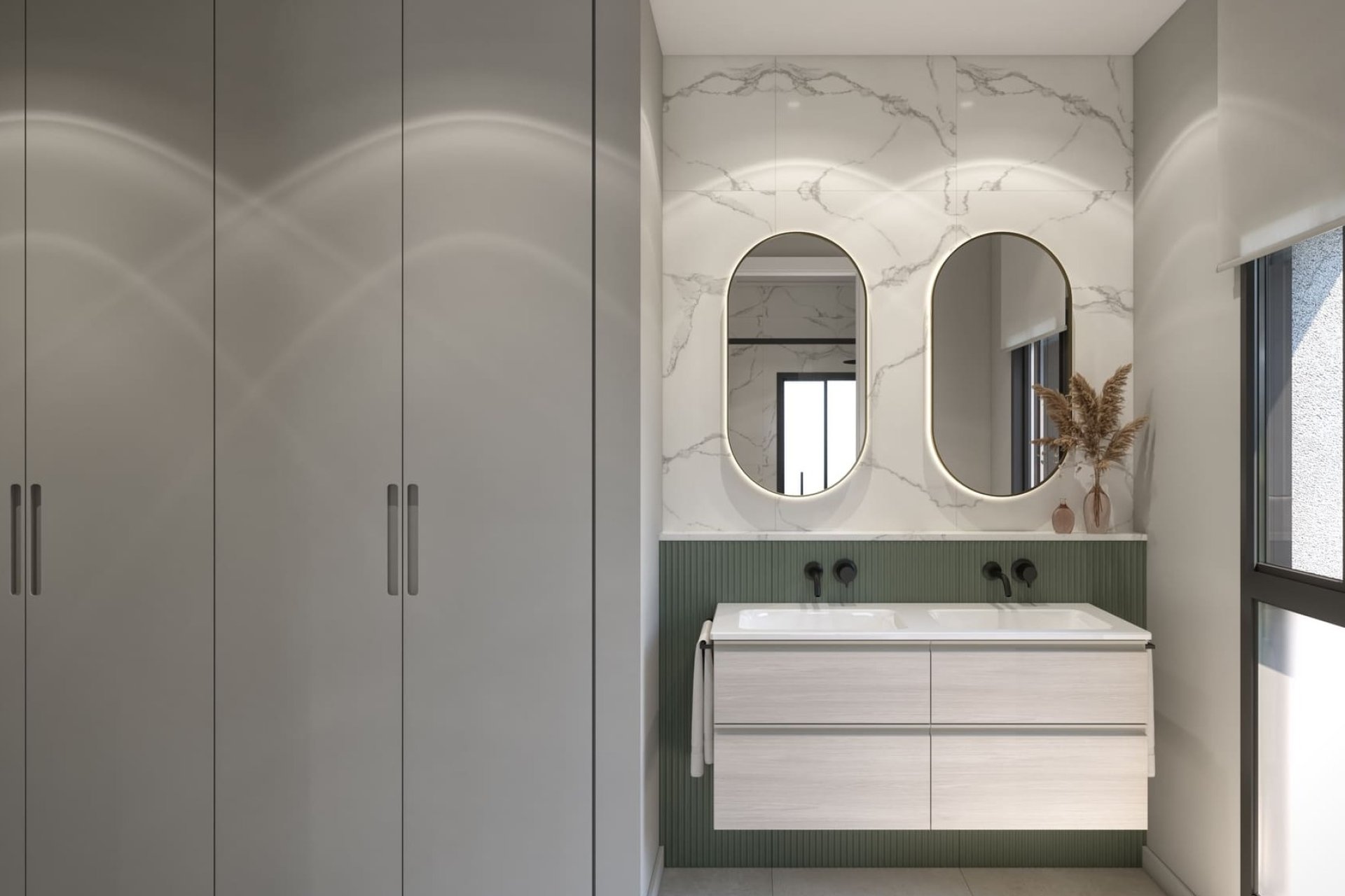 The interior of these villas has been designed to offer maximum comfort and functionality. With three bedrooms and two bathrooms, each space is optimized to meet the needs of a modern family. Porcelain tile floors add a touch of elegance and are easy to maintain. The villas are equipped with high-quality appliances, ensuring the kitchen is both practical and stylish. Electric shutters and built-in wardrobes are standard features that add convenience and efficiency to daily life. Every detail has been carefully considered to create a welcoming and contemporary home.