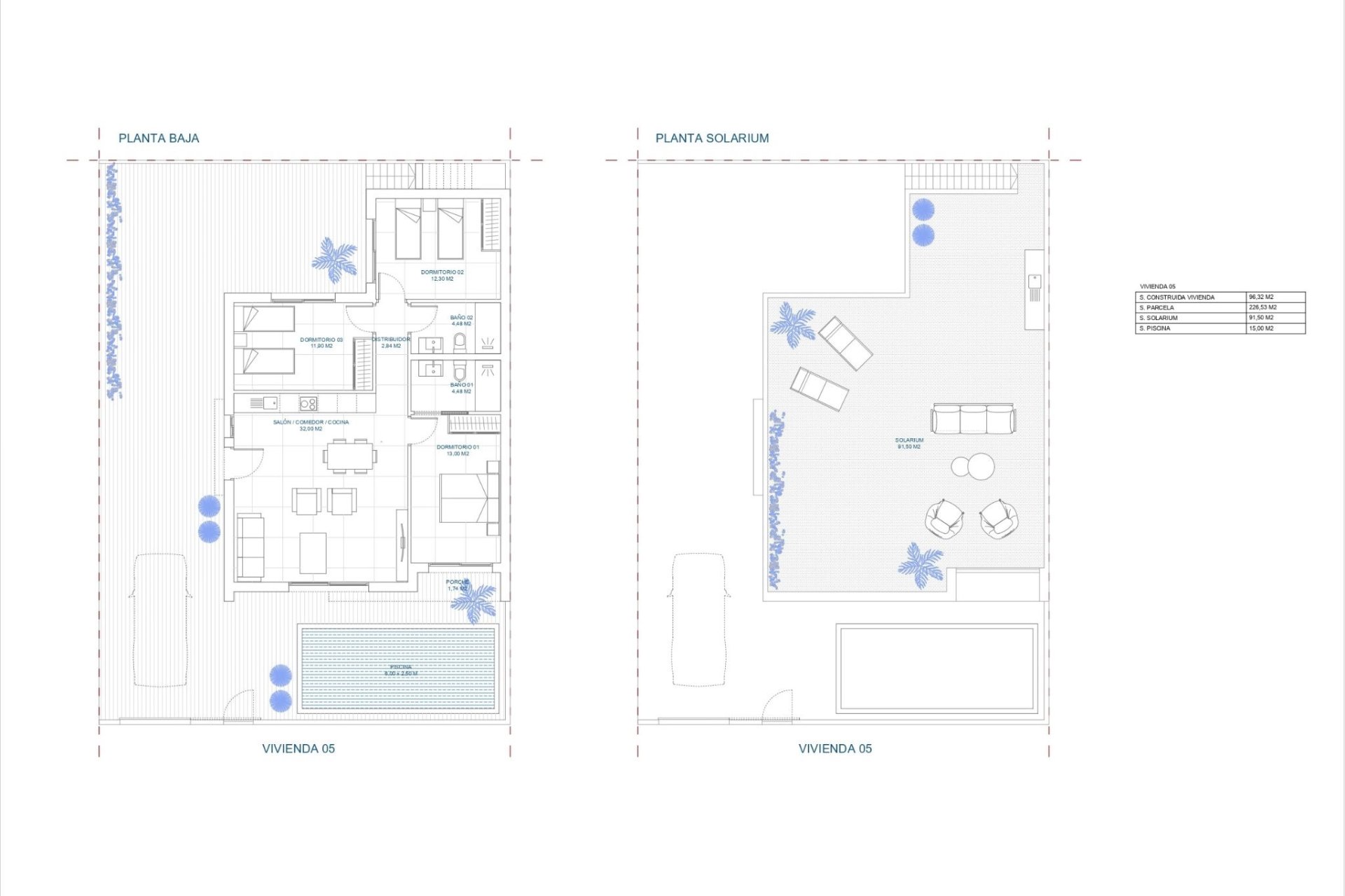 Дома имеют привлекательные внешние пространства, включая частный бассейн, идеально подходящий для наслаждения средиземноморским климатом. Кроме того, каждая недвижимость располагает солярием, предлагая дополнительное открытое пространство для отдыха или общения. Наличие террасы дополняет внешний дизайн, предоставляя идеальное место для наслаждения видами и природной средой Торре-Пачеко.
